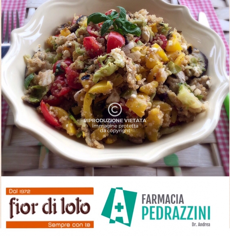 ingredienti e dosi per due persone.: - 140gr di quinoa - un pererone giallo - una melanzana -due zucchine - dieci pomodorini datterini - dieci cavoletti di Bruxelles - una cipolla bianca - 50gr di formaggio greco tipo (feta) - olio extra vergine d'oliva - aceto di mele - sale - basilico. Preparazione: sciacquare molto bene la quinoa in acqua corrente e fare cuocere in acqua bollente per circa 20 minuti, grigliare le verdure ( melanzane, peperoni, zucchine ) in forno o in una padella antiaderente, bollire i cavoletti di Bruxelles e tagliarli a pezzetti insieme alle verdure grigliate, affettare la cipolla a listarelle sottili, i pomodori a dadini e unire alla quinoa con tutte le verdure grigliate e i cavoletti di Bruxelles, spolverare con il formaggio greco tipo ( feta ) e il basilico a pezzi grossolani. Condire con olio extra vergine d'oliva, aceto di mele e un pizzico di sale.