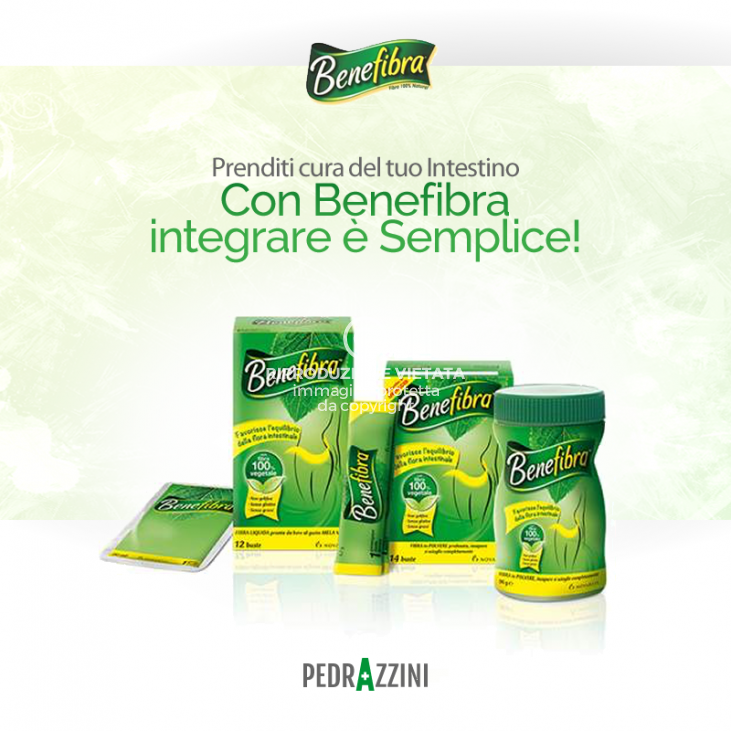 Per aiutare la flora intestinale è fondamentale integrare con la fibra. Esistono diversi prodotti, ma vi consigliamo Benefibra. Un prodotto disponibile in farmacia, non gelificante, ad elevato contenuto di fibre: la dose giornaliera consente l'apporto di 5g di fibre, un valido aiuto in casi in cui l'assunzione di fibre alimentari con la normale dieta è ridotta o quando il fabbisogno di fibre risulta aumentato.
